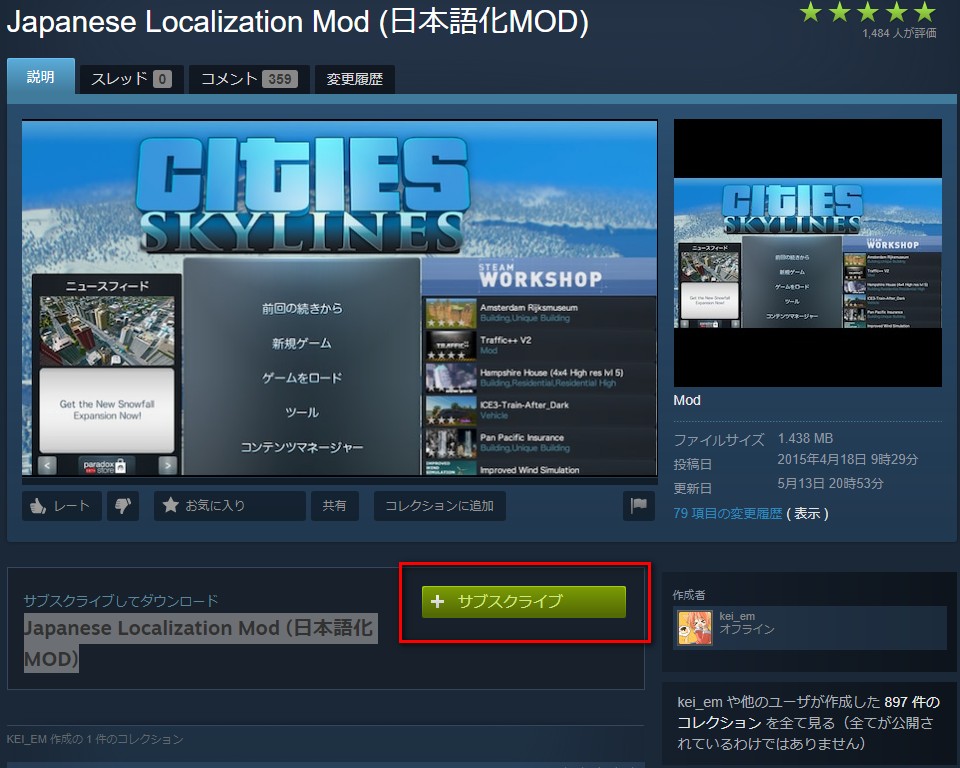 Steamにログインした状態で、steamワークショップのCities: SkylinesSteam 「Japanese Localization Mod (日本語化MOD)」のページを開きます。